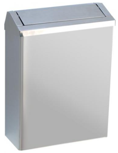 Контейнер прямоугольной формы выполнен в цвете хром с матовой поверхностью. Устанавливается на стену. Не имеет замок безопасности на крышке.