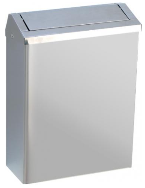 Контейнер прямоугольной формы выполнен в цвете хром с глянцевой поверхностью. Устанавливается на стену. Не имеет замок безопасности на крышке.