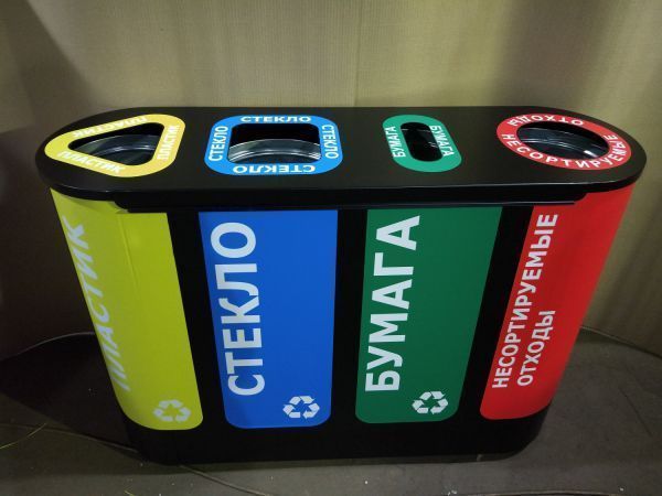 Контейнеры выполнены из стали и покрашены в черный цвет. Есть специальная крышка с отверстиями разной формы. Для удобного использования укомплектована наклейками разного цвета с надписями: пластик, стекло, бумага, несортируемые отходы. Снизу имеется противоскользящая резиновая окантовка.